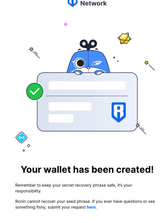 크롬 브라우저에서 주소창 우측의 퍼즐모양을 클릭하신 후 전과 같이 Ronin Wallet를 클릭하시면 위와 같이 지갑을 여실 수 있습니다.