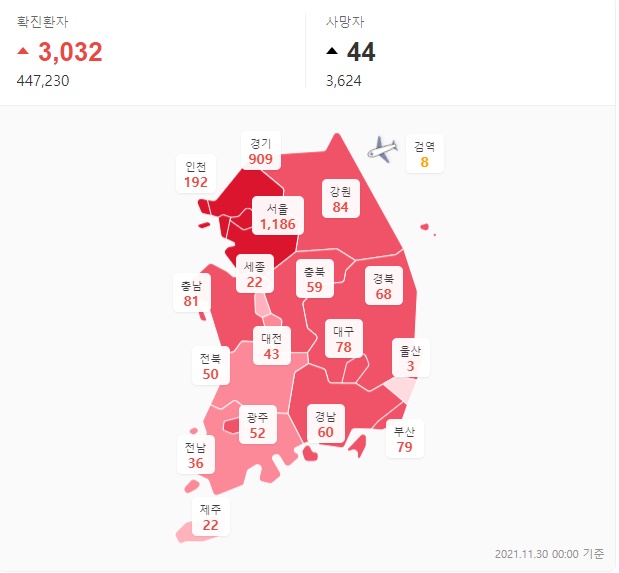 코로나 환자 발생현황은 2021.11.30 00:00 기준으로 3032명, 사망자는 44명이었습니다.
